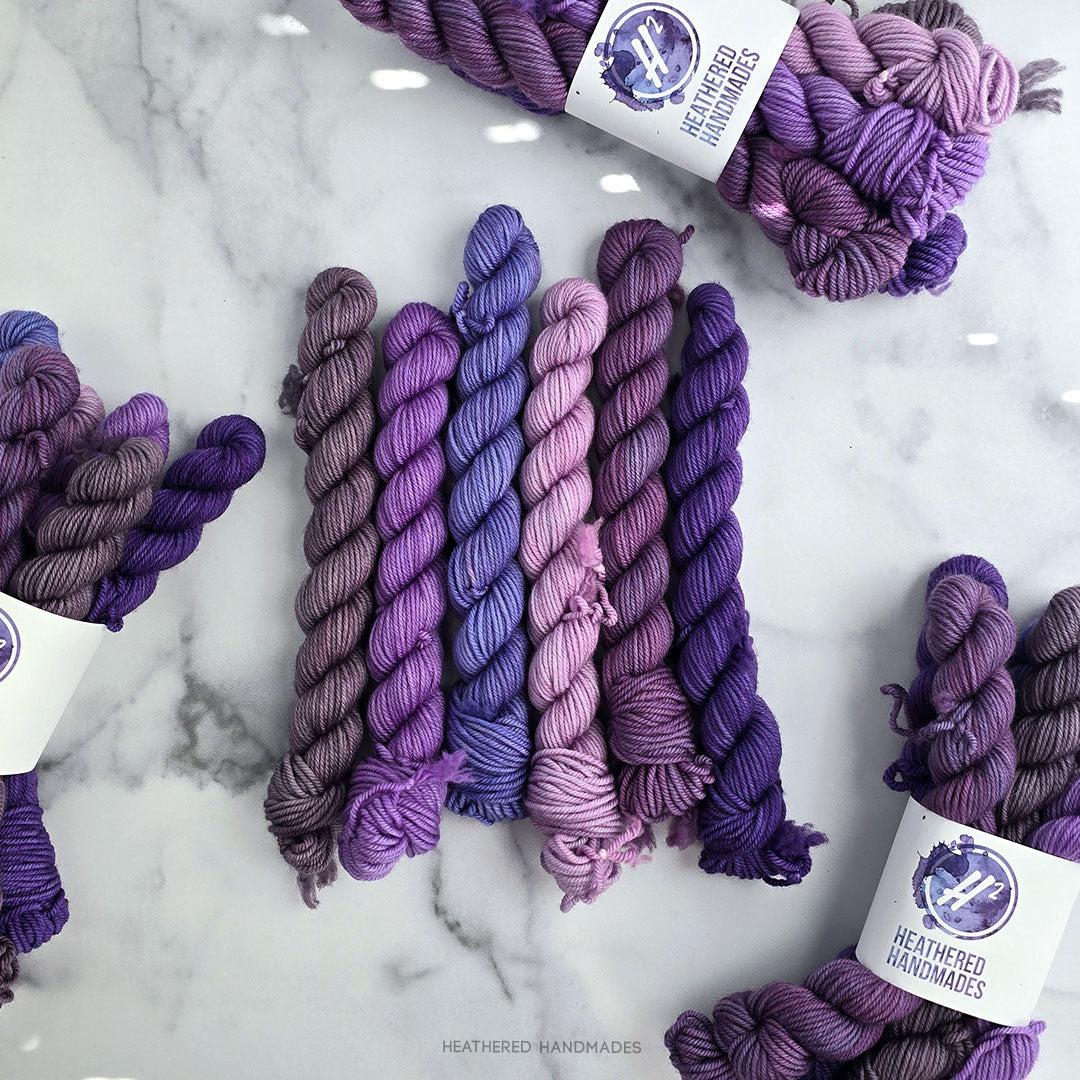 This set contains 6 different mini skeins of one of a kind purple colorways!